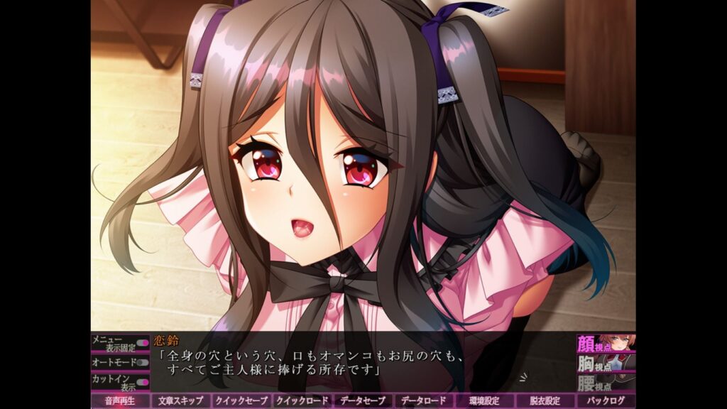 恋鈴01 | 三つ指ついて奴隷宣誓、足指舐め、フェラ奉仕。 【W処女喪失】両膝抱え正常位(膣→アナル)。 | 通常衣装 | 主人公の自室 |